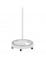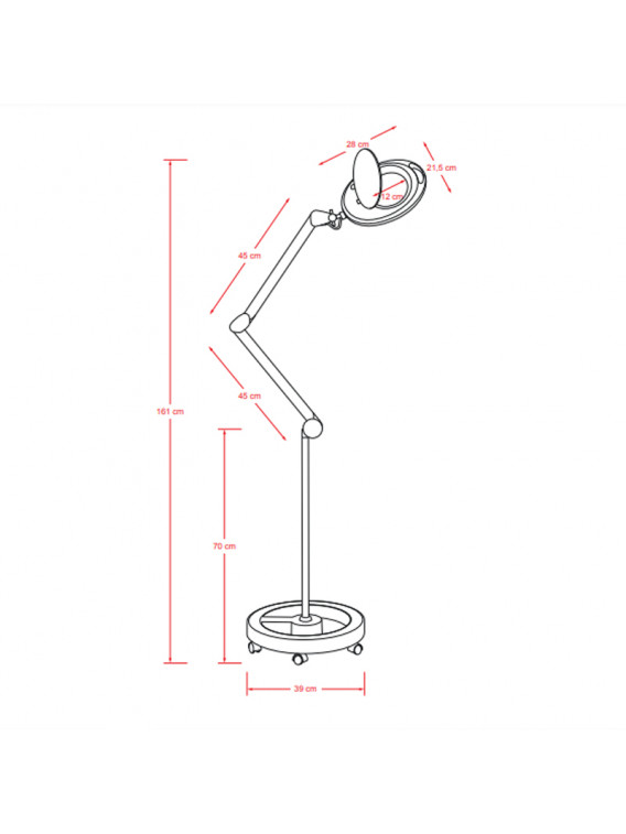 Equipada con brazo articulado, mordaza para fijación en mesas o carritos de belleza y base compacta de 5 ruedas de máxima estabilidad.