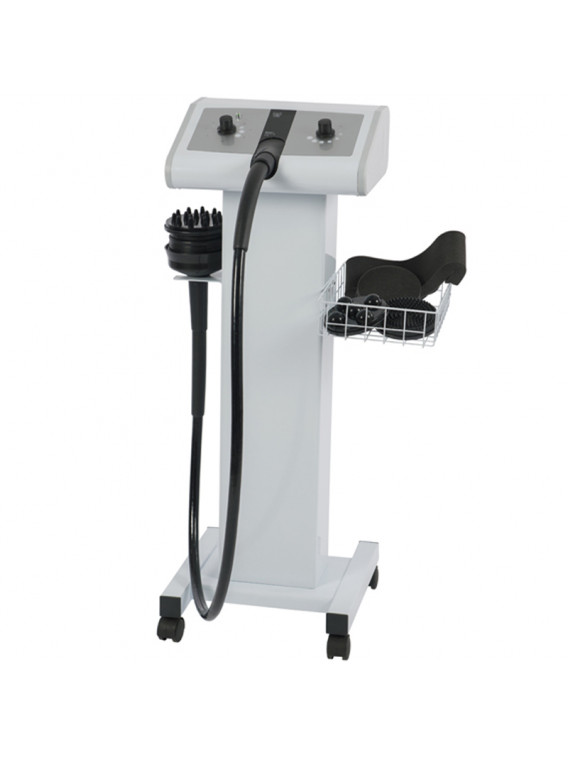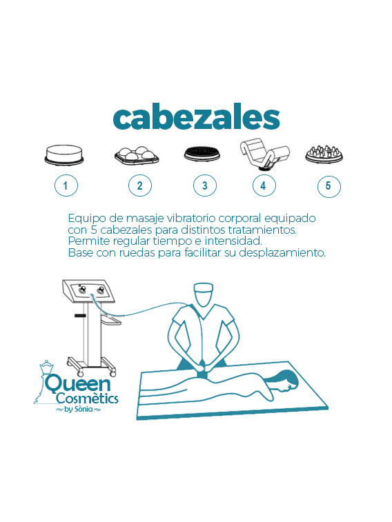 Equipo de masaje vibratorio corporal equipado con 5 cabezales para distintos tratamientos.