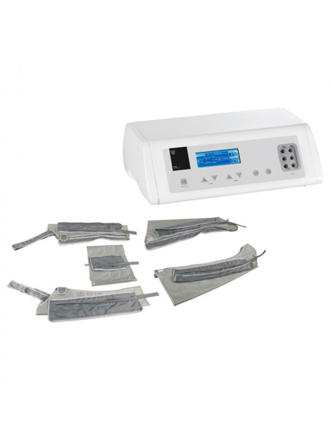 Equipo de presoterapia con traje compuesto de botas, faja abdominal y brazos.