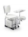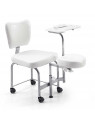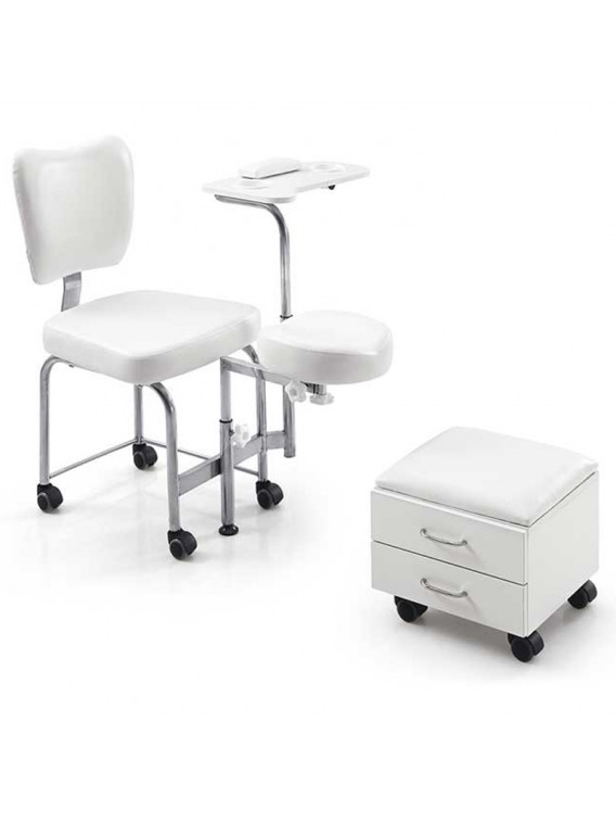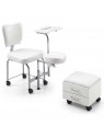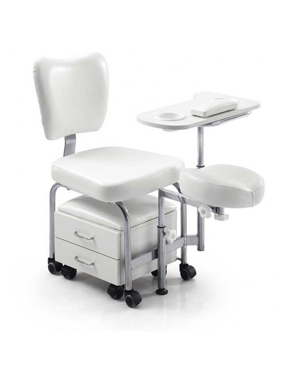Silla de pedicura que incorpora taburete con 2 cajones de almacenamiento, ambos con ruedas.
