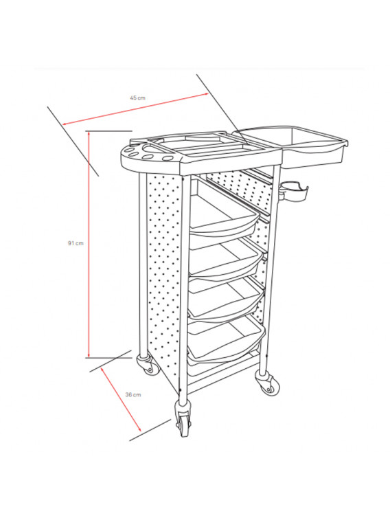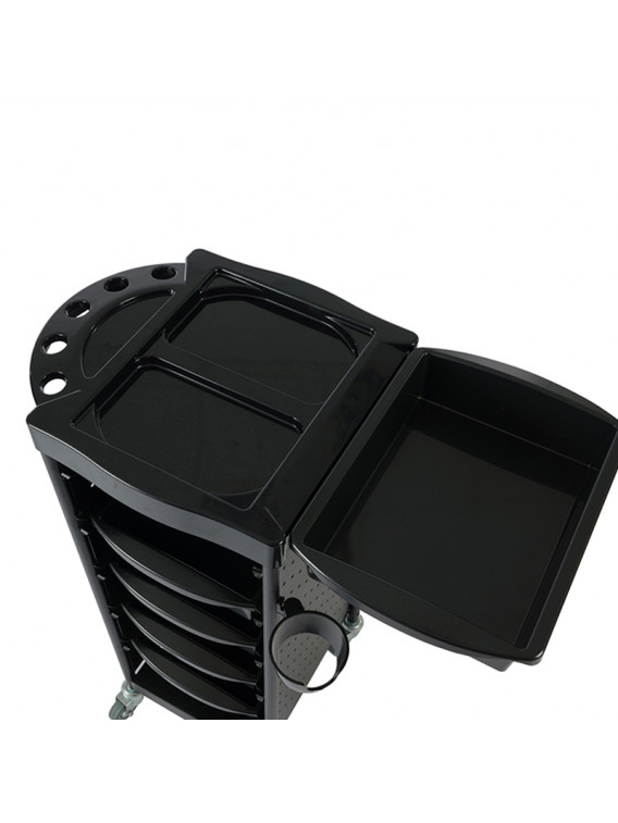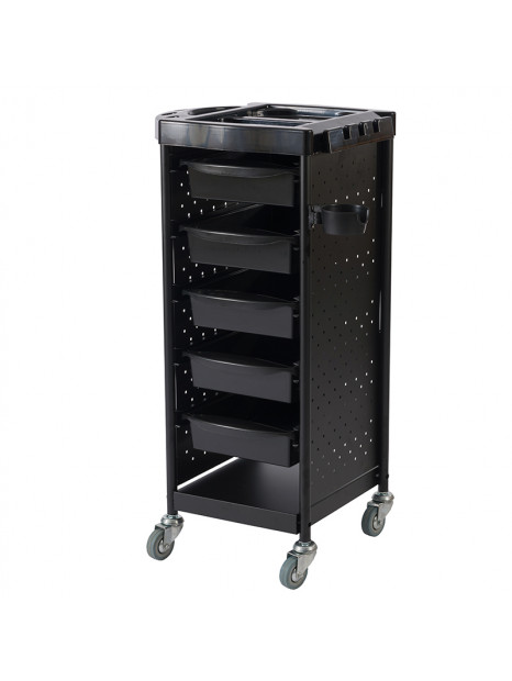 Carrito de peluquería con 5 cajones extraíbles y bandeja superior.