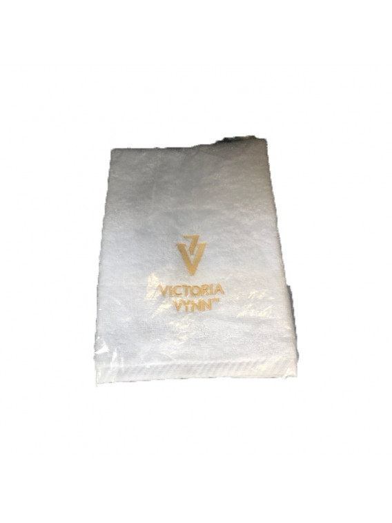 Toalla blanca de 30 x 50 cm, con logo de Victoria Vynn en color dorado.